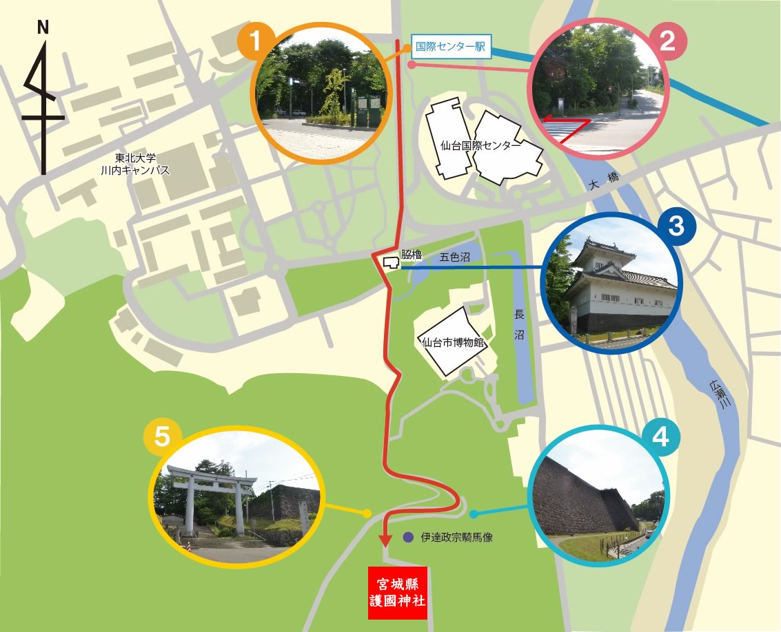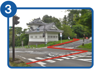 ●「仙台城跡南」で下車し、車の往来に気をつけて反対側へ渡ります。道を渡ると左手側に仙台城跡の入口が見えます。